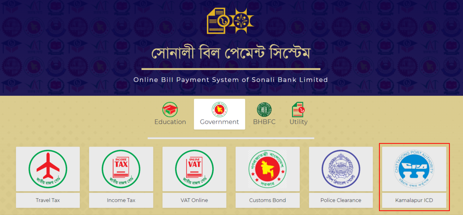 | "Government" ট্যাবের অধীনে "Kamalapur ICD" পরিষেবা নির্বাচন করুন অথবা সরাসরি এই (https://billpay.sonalibank.com.bd/ICD/Payment/Index) লিঙ্কে প্রবেশ করুন। |