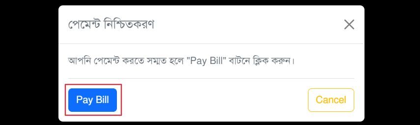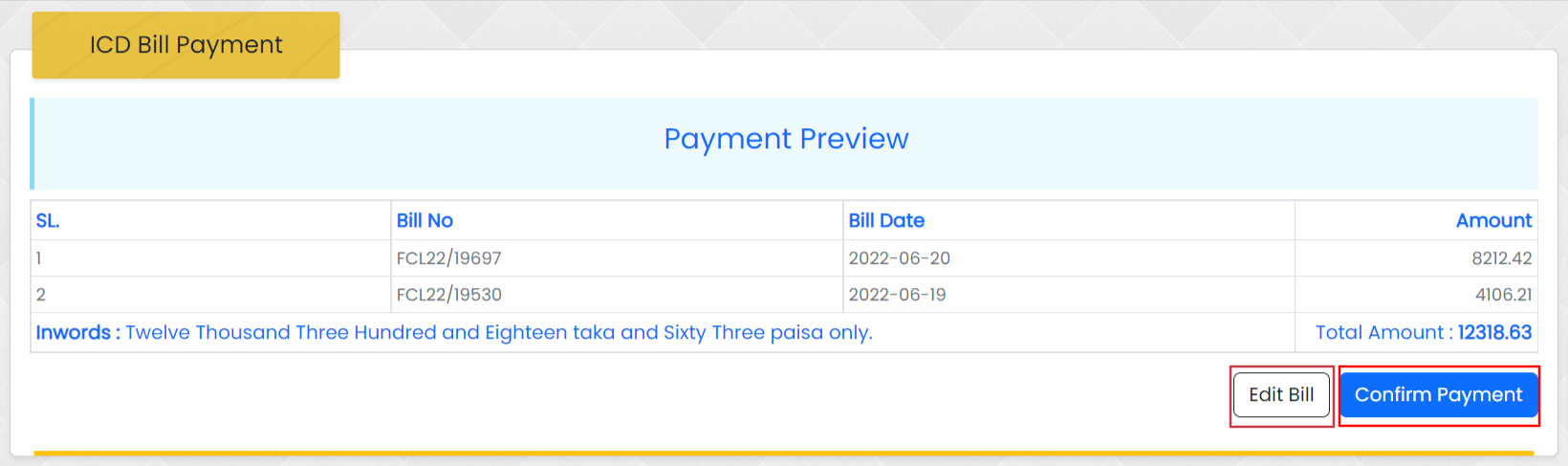 | "Preview Bill" বাটনে ক্লিক করলে পেমেন্ট প্রিভিউ পেজ আসবে, বিল পরিবর্তন/এডিট করতে চাইলে "Edit Bill" বাটনে ক্লিক করুন। |