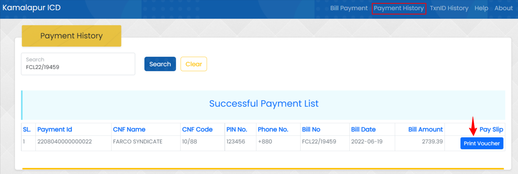 | "ন্যাভিগেশন মেনু > পেমেন্ট হিস্টোরি" ক্লিক করে Bill No / Payment Id / PIN / CNF Code / Phone No দিয়ে অনুসন্ধান করে সফল পেমেন্ট হিস্টোরি দেখুন। |